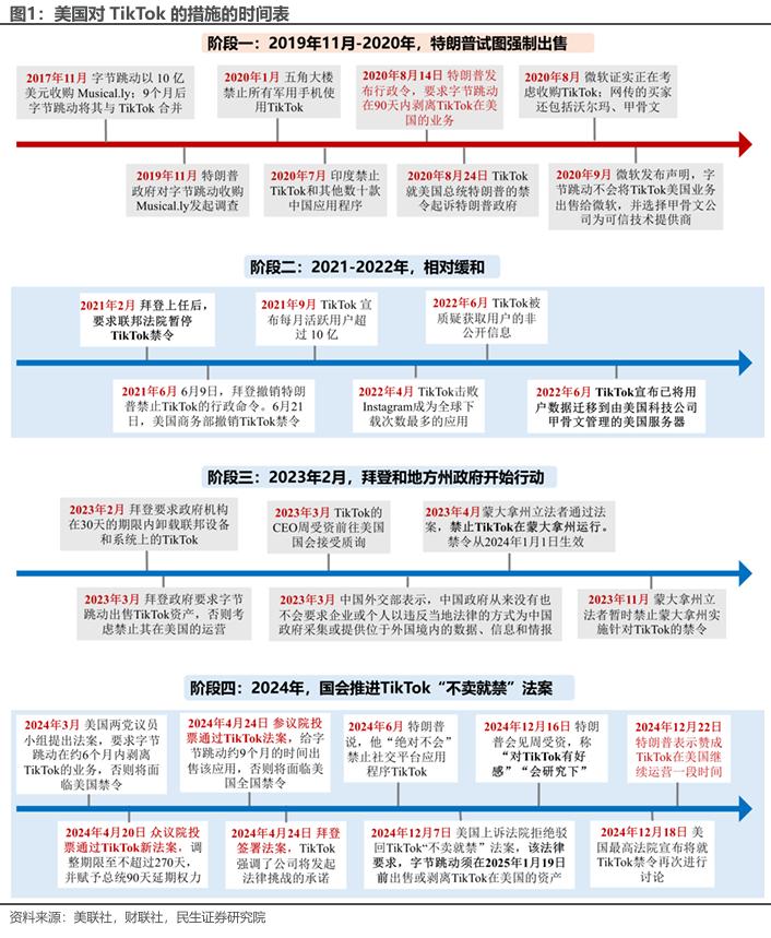 阶段四:2024年,国会推进TikTok“不卖就禁”法案。2024年4月美国众、参议院先后投票通过“不卖就禁”法案,并由拜登在4月24日签字生效,给TikTok的母公司字节跳动大约9个月的时间(最后期限为2025年1月19日)出售该应用。