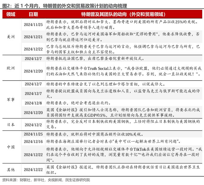 中国方面,特朗普提出对华加征10%关税,并在12月22日对TikTok放宽态度。相比之下,特朗普对中国的“针对性”并不突出。
