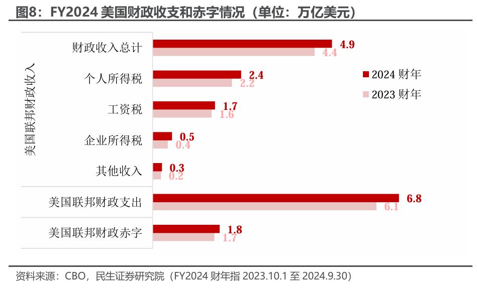 2024财年美国政府的收入如何?2024财年美国财政收入4.92万亿美元,较FY2023增长10.8%。企业盈利上升、企业所得税收入大幅增长了26.3%;个人所得税和工资税分别较FY2023增长11.5%和5.9%。