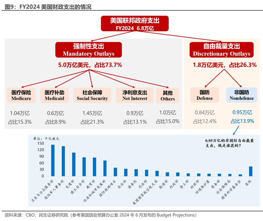 “政府效率部(DOGE)”负责人马斯克承诺削减2万亿美元预算(即6.8万亿支出中的近30%)。 从财政支出的两大类来分析(图9),节省2万亿难度较大。