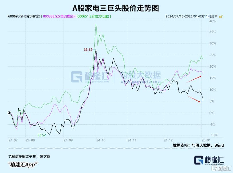 自从2024年10月8日刷新历史新高后,千亿家电巨头海尔智家 (HK:6690)股价开始持续步入回调,期间累计跌幅超过20%,对比同期美的、格力两巨头的股价明显走弱。