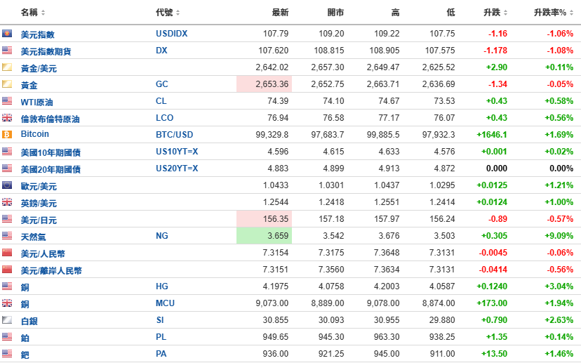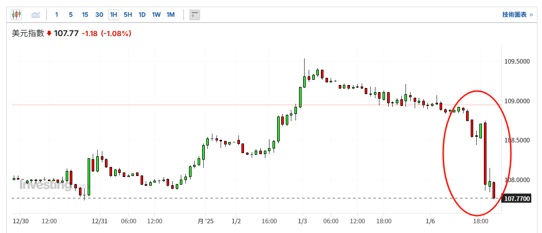 美元指数期货、美元指数大跌1%。