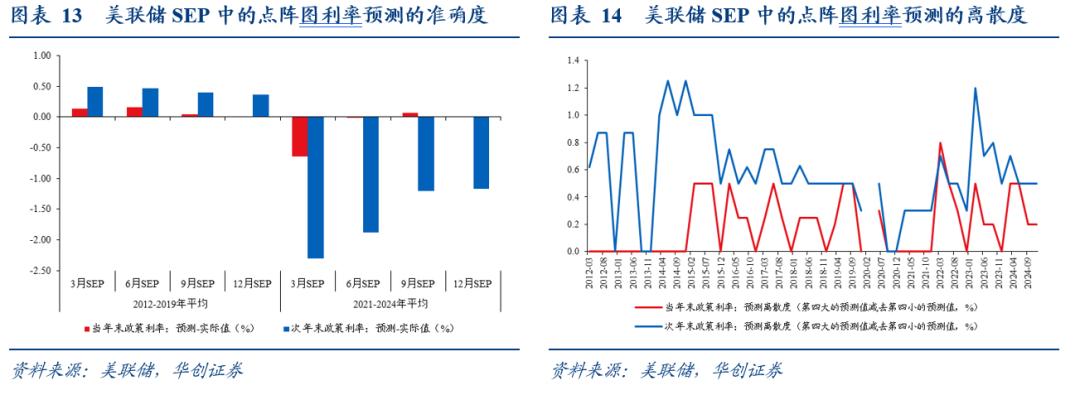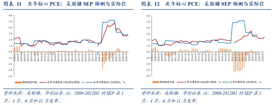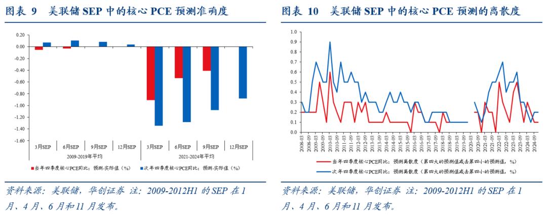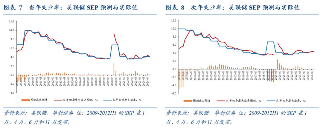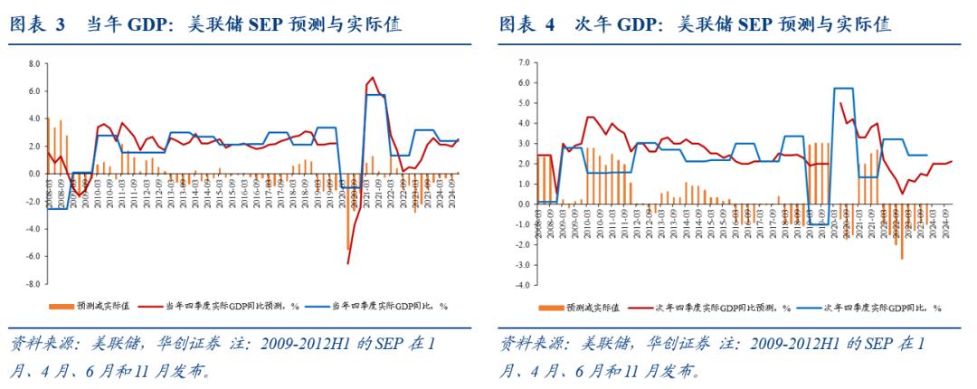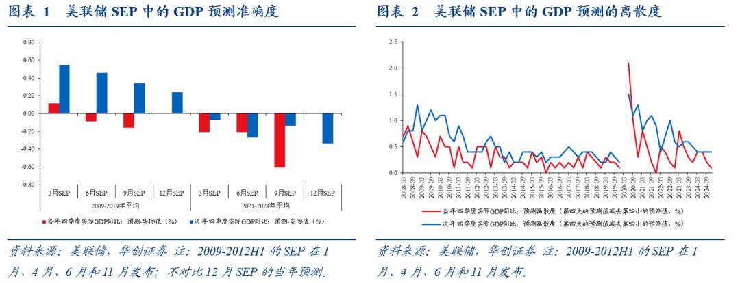 美联储的经济预测是指每年发布四次的SEP(Summary of Economic Projections,经济预测摘要)。美联储FOMC一年召开8次常规议息会议,从2007年10月议息会议开始,FOMC参与者(7个理事会成员和12个地区联储主席)会在每年四次FOMC会议中提交个人对美国经济指标的预测,在2012年上半年之前,SEP在每年1月、4月、6月、11月(2008年是10月)的会议期间发布,从2012年下半年开始,SEP在每年3月、6月、9月、12月的会议期间发布。SEP中的预测指标包括实际GDP同比、失业率、PCE同比、核心PCE同比,这些指标均为每年四季度的数据,而非年度值。从2012年开始,SEP提供对政策目标利率的个人预测。