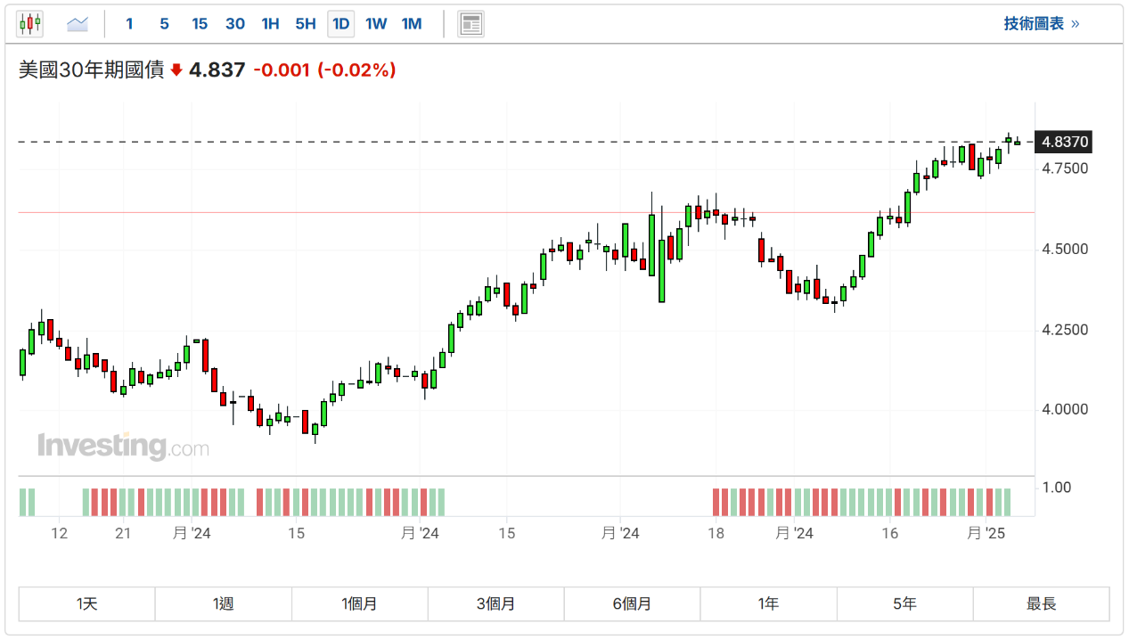 美国30年期国债收益率最高触及4.861%,创2023年11月以来新高。