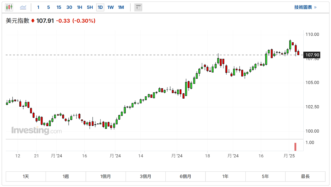 周二(7日),疲软经济数据和特朗普考虑仅针对关键进口商品实施普遍关税的打压下,美元指数继续走软,跌破108关口。