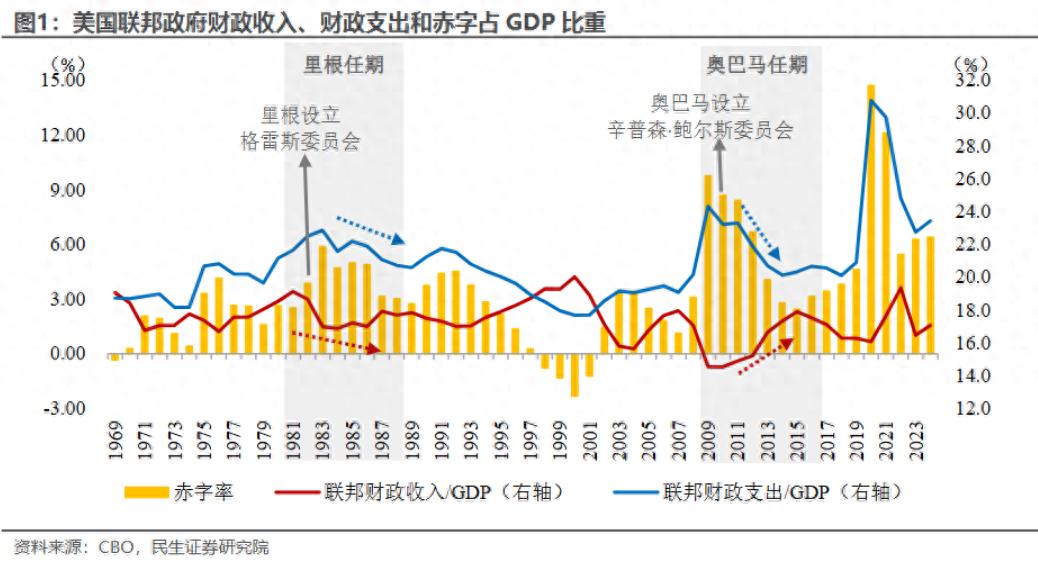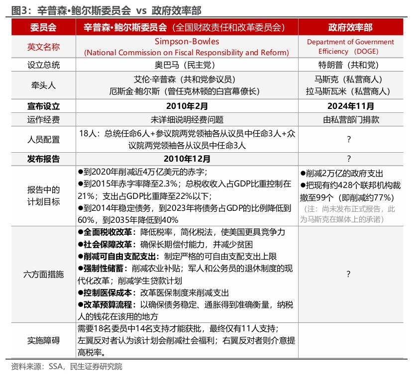 我们预计“政府效率部”最后效果或与历史类似,即:特朗普2.0任期内,赤字率确实有望下降;但其提出3%的赤字率目标、马斯克提出的削减2万亿美元支出,达成的概率较低。