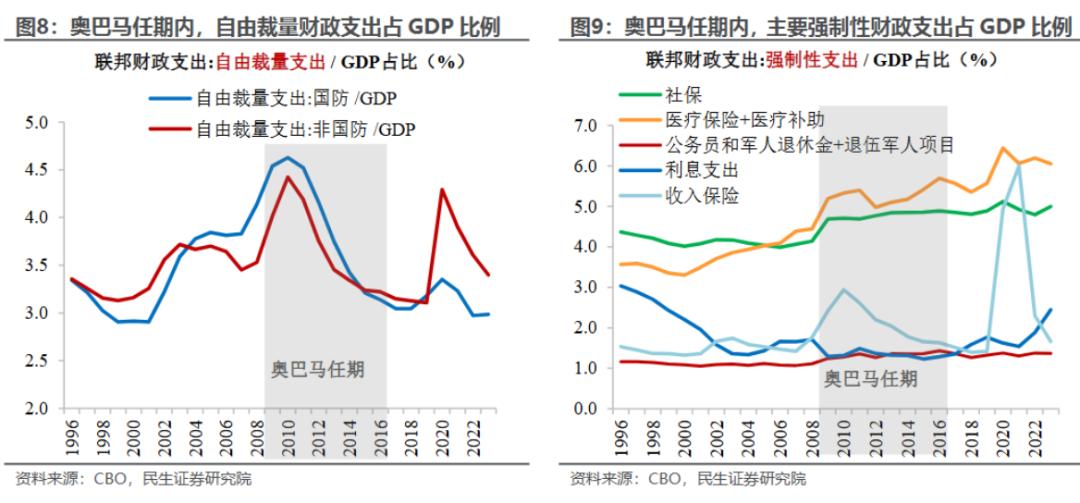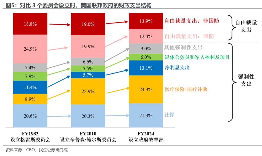 削减的主要是非国防自由裁量支出,退休公务员和军人福利也有所削减,而国防支出、社保医保、净利息支出上升。自由裁量支出和净利息支出下降,而社保医保、退休公务员和军人福利上升。