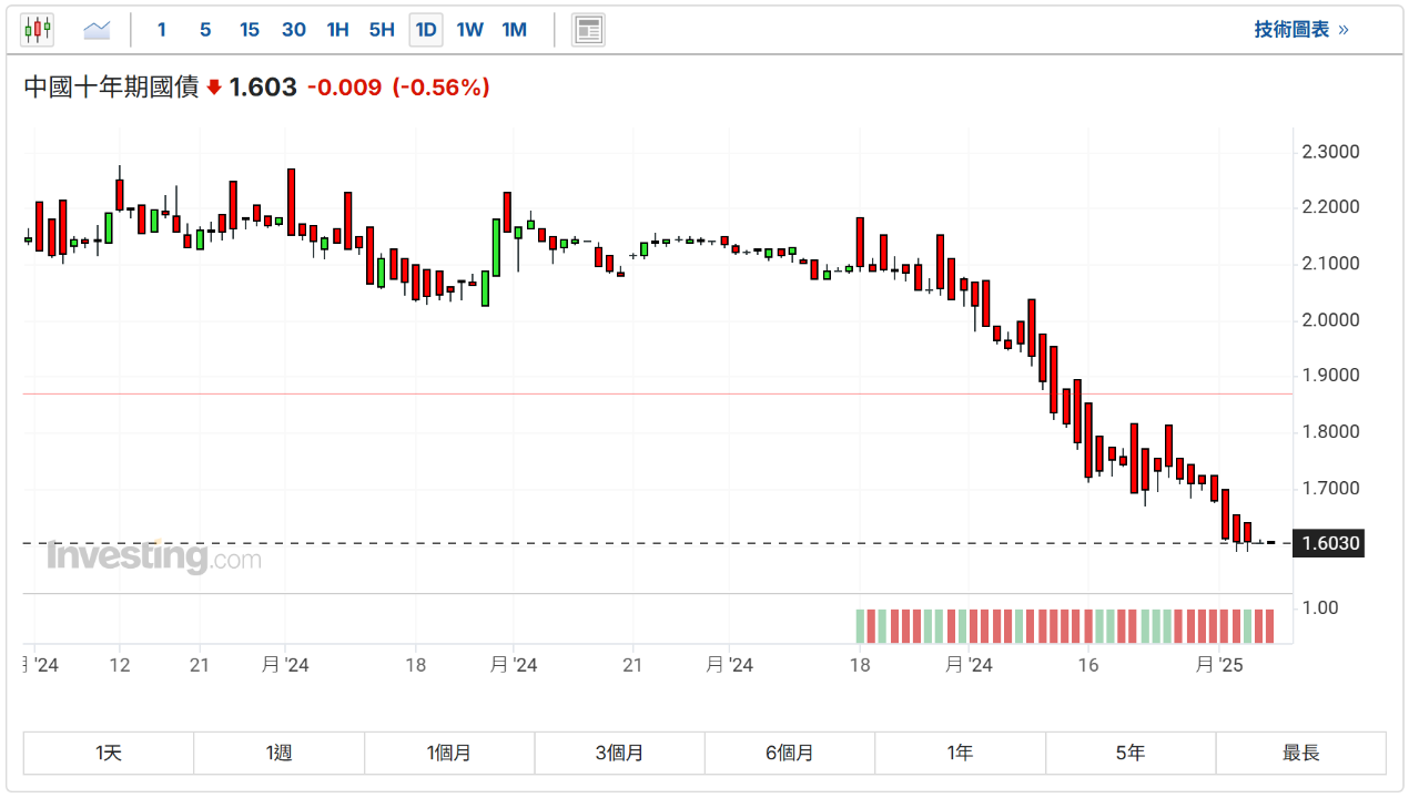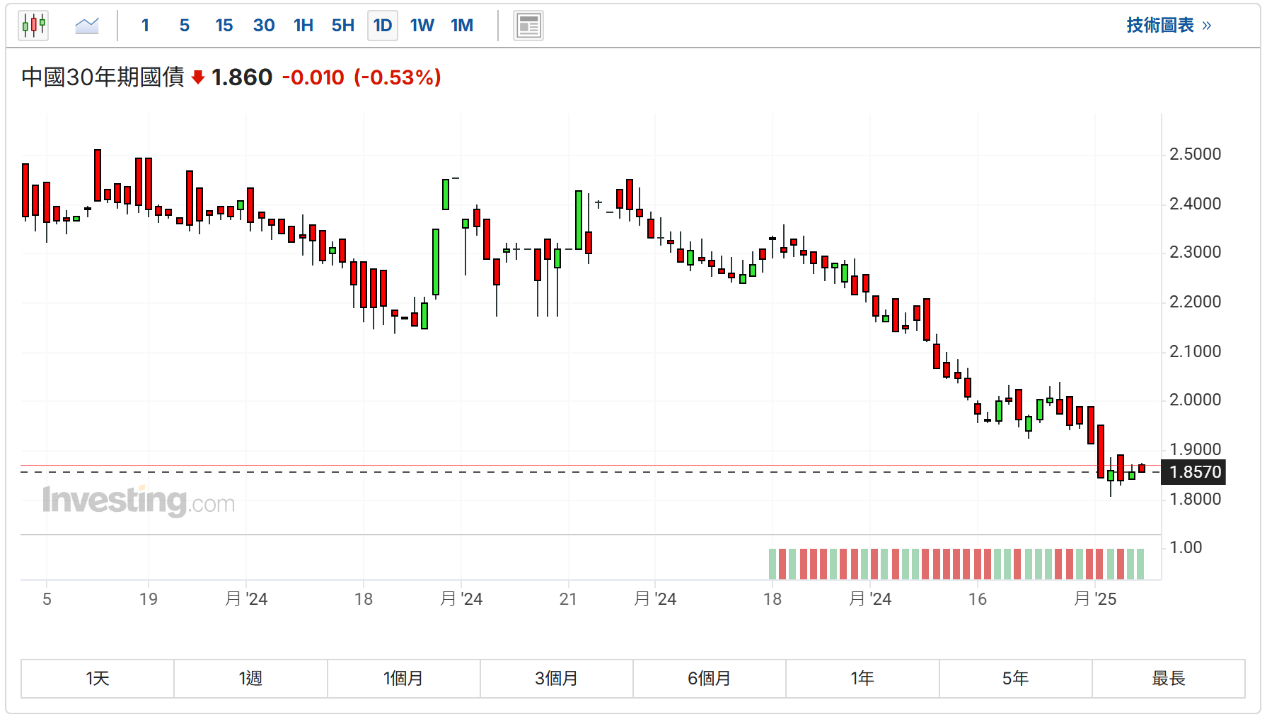 中国长债收益率低位徘徊,中国30年期国债收益率持续跌破2.0,中国十年期国债收益率跌至1.603%。