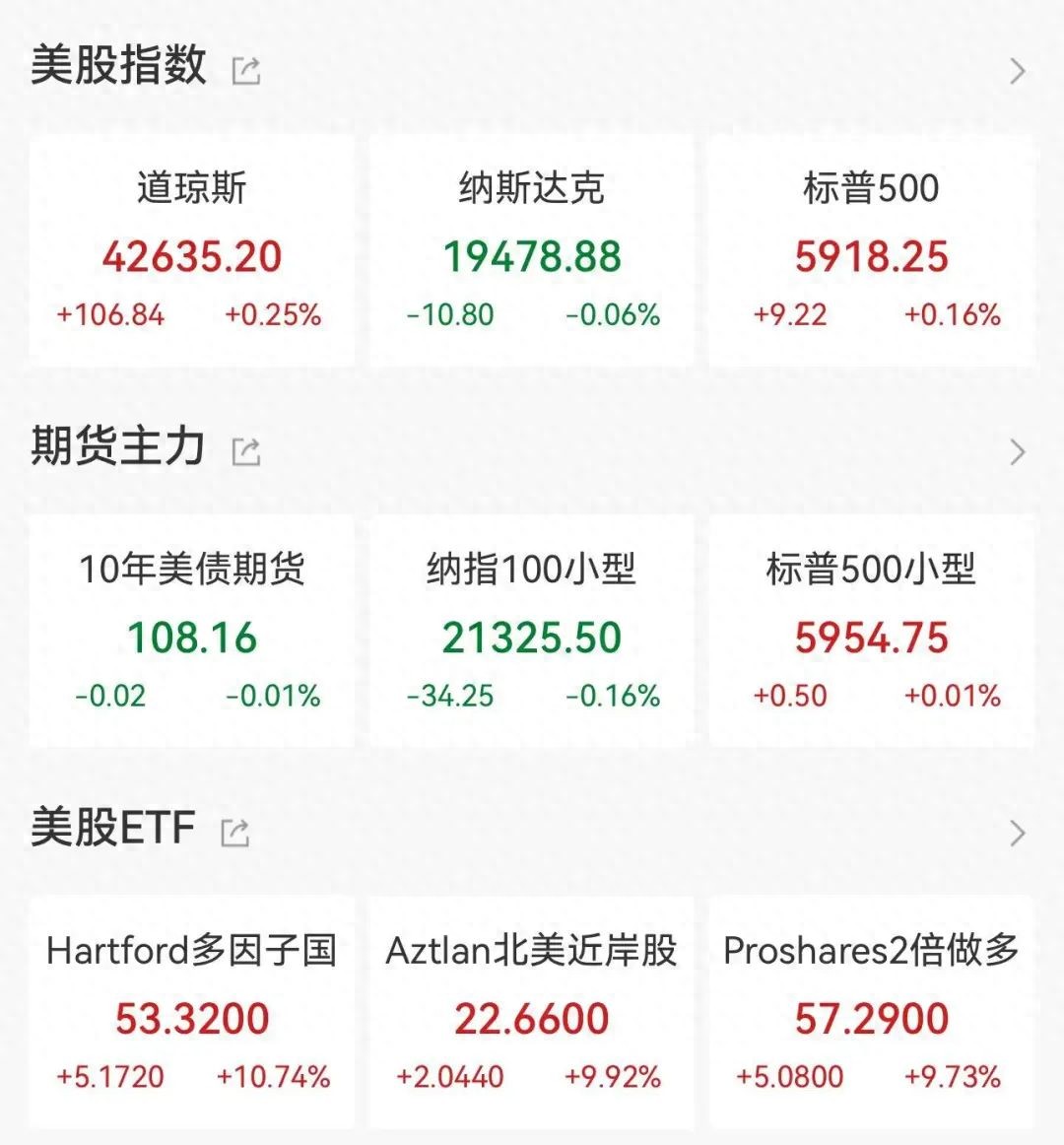 美国标准普尔500指数上涨0.16%,收于5,918.25点,纳斯达克综合指数下跌0.06%,收于19,478.88点。道琼斯工业平均指数上涨106.84点,收于42,635.20点,涨幅0.25%。