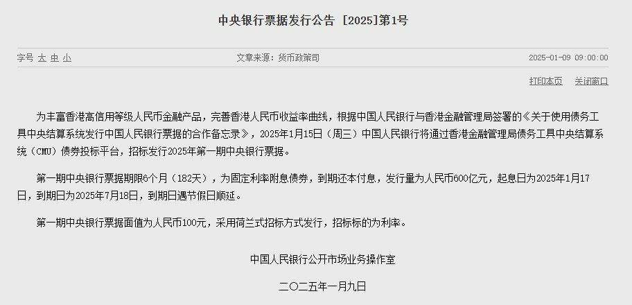 1月9日,央行公告称,为丰富香港高信用等级人民币金融产品,完善香港人民币收益率曲线,根据中国人民银行与香港金融管理局签署的《关于使用债务工具中央结算系统发行中国人民银行票据的合作备忘录》,2025年1月15日(周三)中国人民银行将通过香港金融管理局债务工具中央结算系统(CMU)债券投标平台,招标发行2025年第一期中央银行票据。