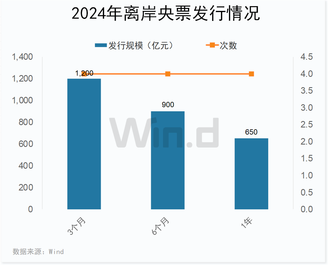 Wind统计显示,2024年央行在香港发行了2750亿元的离岸央票。其中,3个月、6个月和1年期合计分别发行规模为1200亿元、900亿元和650亿元。从发行次数上看,三个期限均发行了四次。