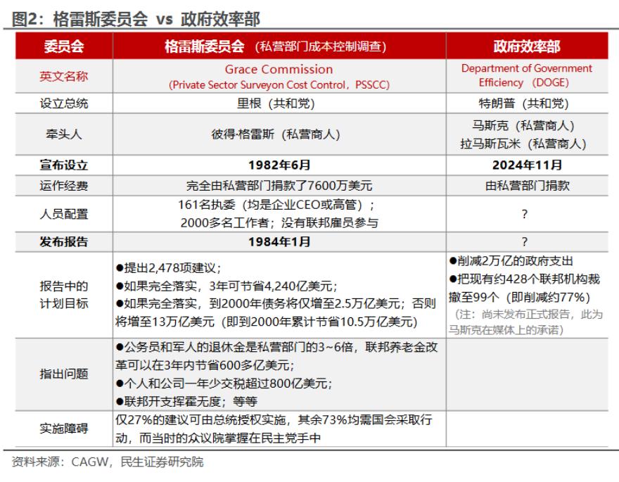 我们预计“政府效率部”最后效果或与历史类似,即:特朗普2.0任期内,赤字率确实有望下降;但其提出3%的赤字率目标、马斯克提出的削减2万亿美元支出,达成的概率较低。