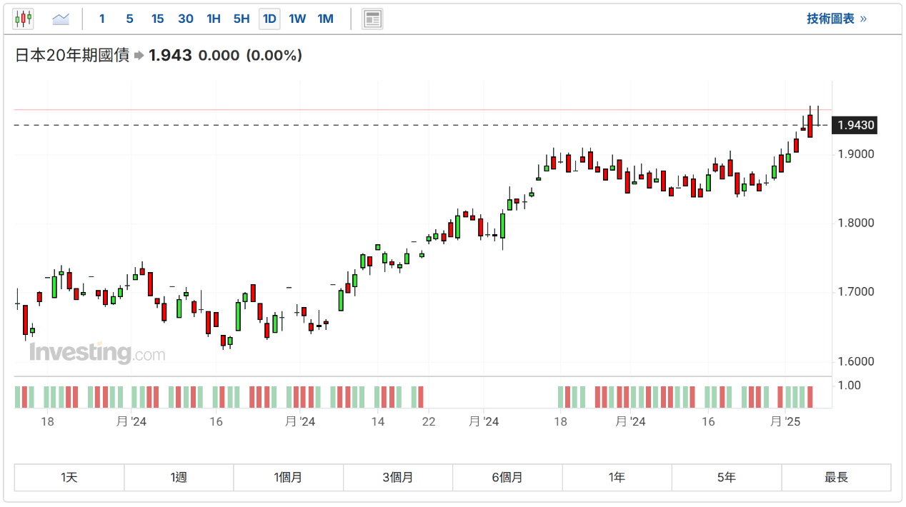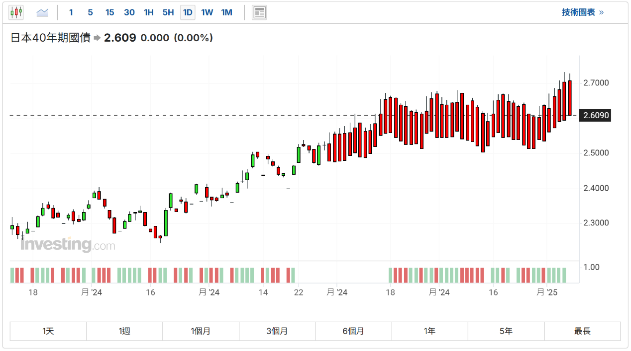 日本40年期国债收益率升至2007年开始发行以来新高。稍早,日本20年期国债收益率自2011年以来首次升至2%。