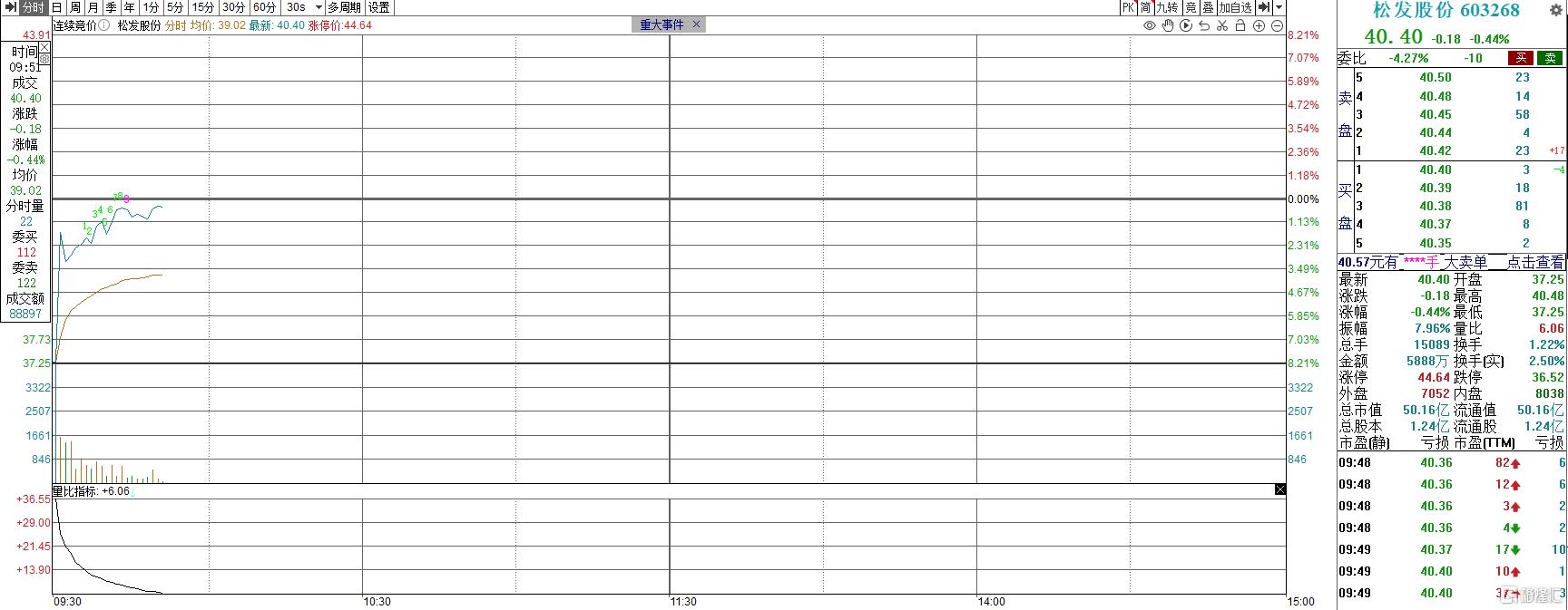 今日,市场在经过昨日的大反弹后走势偏弱,松发股份 (SS:603268)开盘一度跌超8%,现有所回升,股价微跌0.44%,报40.4元/股,总市值50.16亿元。