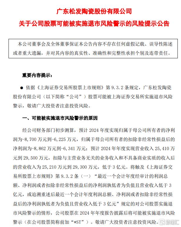同时,松发股份预计2024年度营业收入为2.54亿-2.95亿元,前一年为2.06亿元;扣除与主营业务无关的业务收入和不具备商业实质的收入后的营业收入为2.52亿-2.93亿元,低于3亿元。