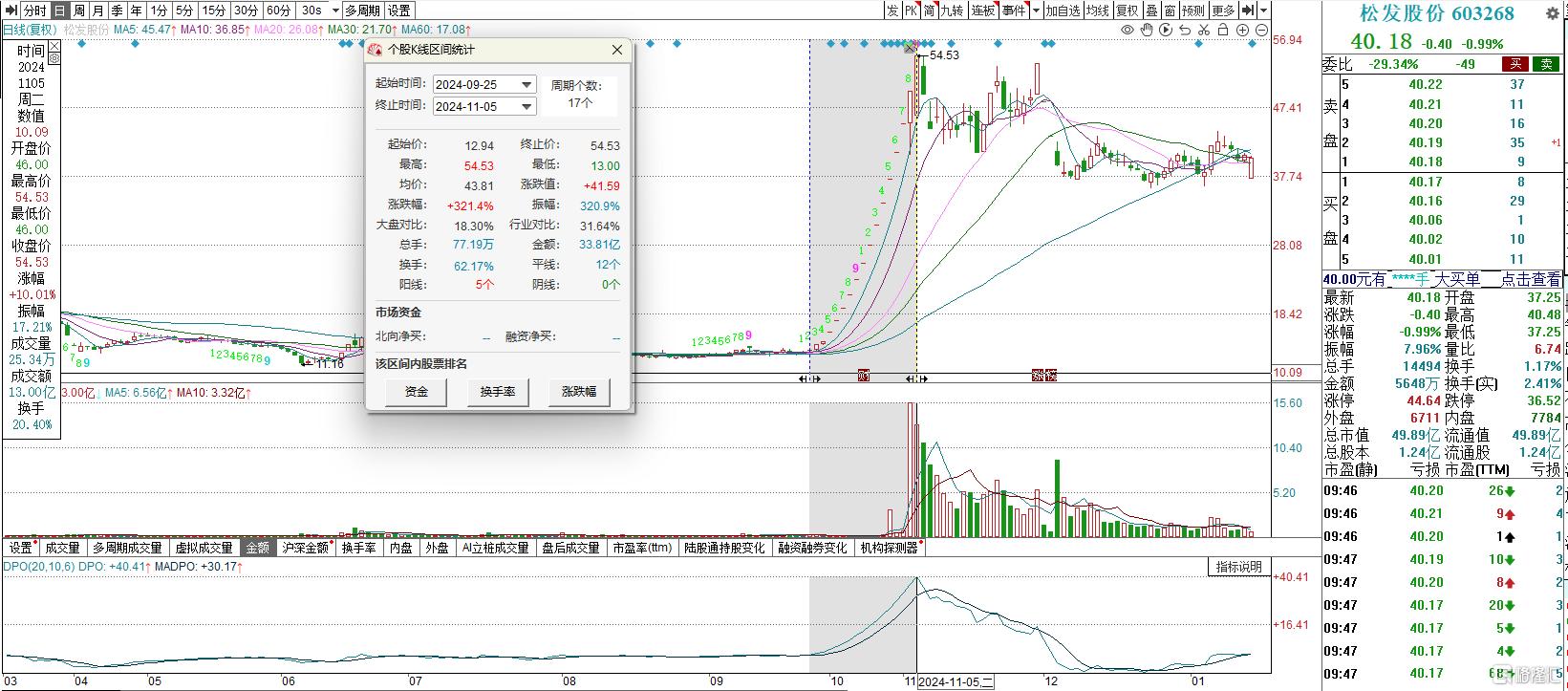 因筹划重大资产重组,松发股份的股价此前连续收获14个涨停,并于2024年11月5日盘中触及历史新高54.53元/股,在17个交易日(2024年9月25日-11月5日)内累计涨超321%,目前已回撤超26%。
