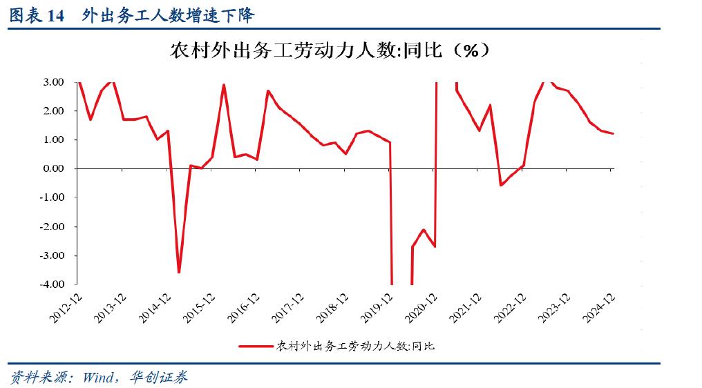 低收入者收入状况的另一个观察指标是农民工的就业状况。2024年,农民工视角下的GDP增速与GDP增速之间的差值持续缩小,显示其就业状况趋于转弱。全年来看,外出农民工17871万人,增长1.2%,此前2023年,外出务工人数同比增长2.7%。月均收入增速方面,从2季度开始,连续三个季度降至4%以下。