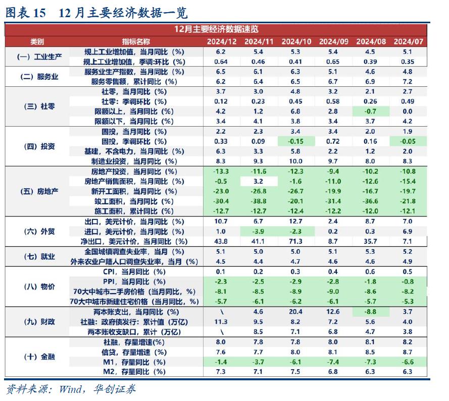 。12月社零增速同比为3.7%,前值为3.0%。出口同比增速为10.7%,前值为6.7%。12月地产销售面积同比为-0.5%,前值为3.2%。12月固投当月同比增速为2.2%,前值为2.3%。
