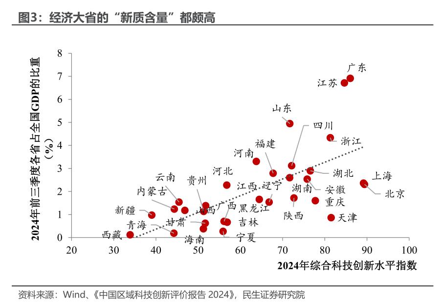 “增新质”与“挑大梁”:经济大省已收获正反馈。从不难看出,“经济大省”在“挑大梁”的过程中更加侧重于“新质生产力”的发展,通过自身产业的转型升级、去缩短新旧动能转换的阵痛期,这在2024年变得更加明显——江苏、浙江、广东等大省已然步入经济发展与科技创新的正反馈循环中。