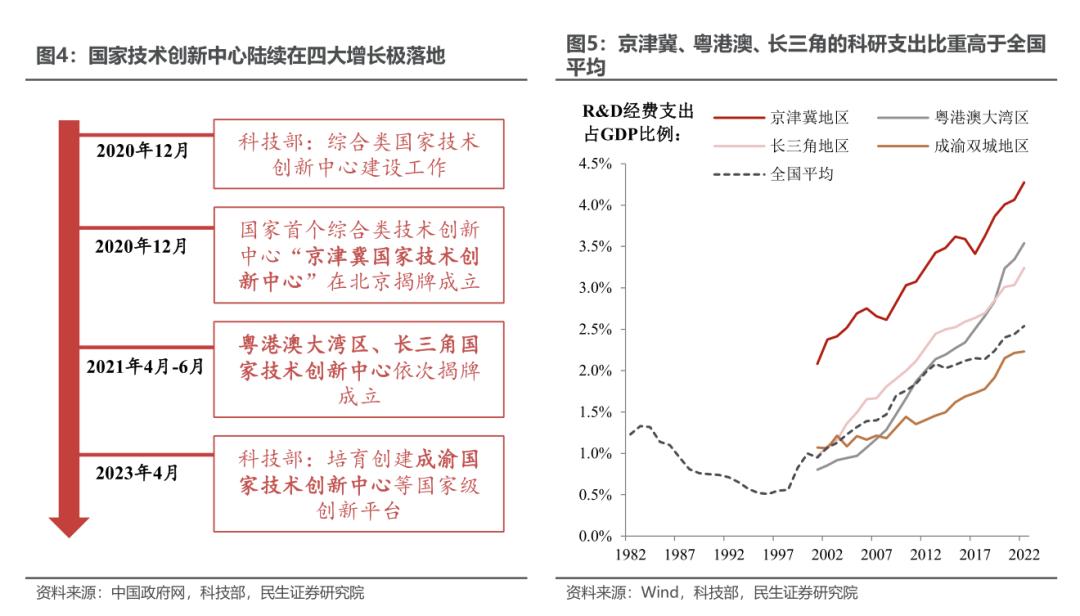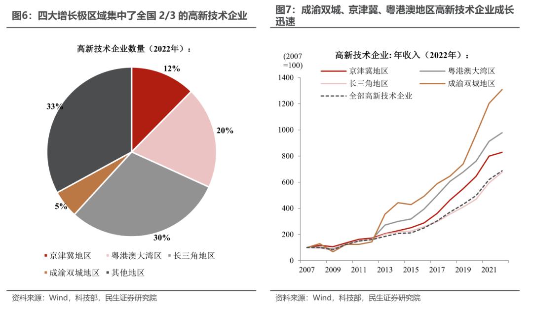聚焦于四大增长极,科技创新正是高速发展的最大底色。四大增长极的科研支出力度大,聚集了全国2/3的高新技术企业。当然,科技创新的背后也有正反馈,比如这些地区的大部分高新技术企业年收入增速都跑赢了全国整体水平。