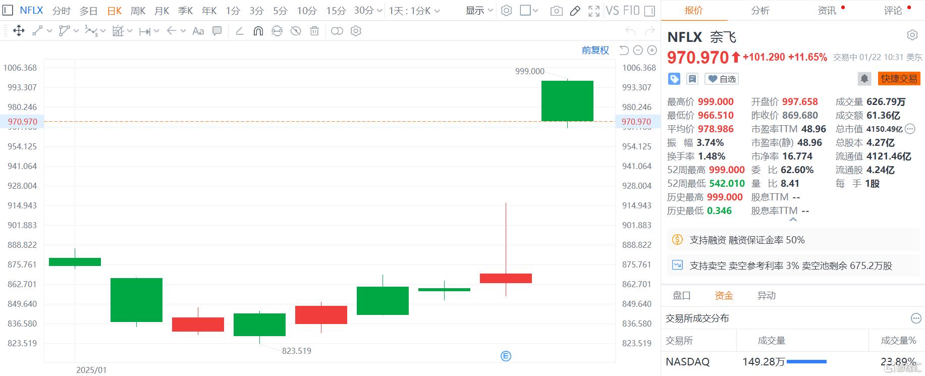 周三美股盘中,奈飞公司 (NASDAQ:NFLX)一度飙涨超13%,股价逼近1000美元并创下新高,现总市值为4150.49亿美元。