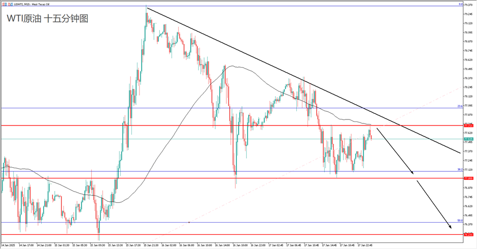 技术面:100均线向下,动能不算很强,形态上呈现三角形收敛,还未有突破迹象。亚盘交易策略应该以逢高做空为主,但需要设好止损。一旦特朗普发表讲话,那么可以关注美盘时段,突破77后的跟空机会。