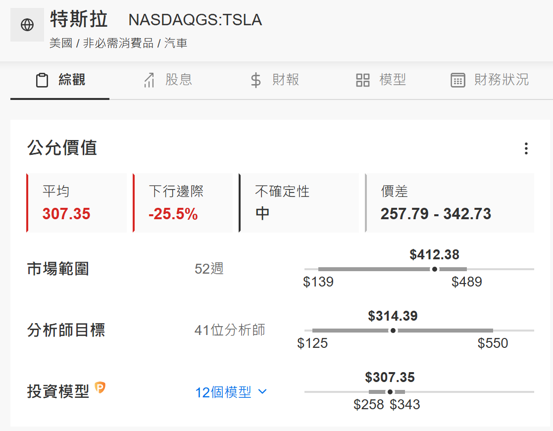 根据InvestingPro数据显示,特斯拉的公允价值为307.35美元,意味着股价存在25.5%的下跌空间。