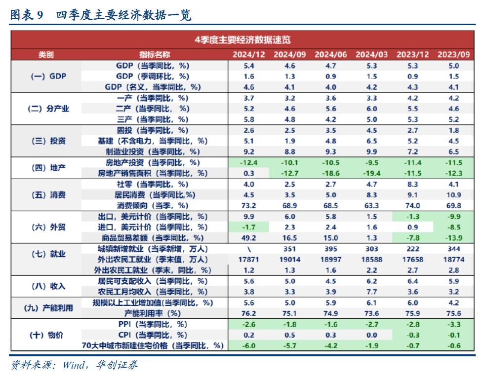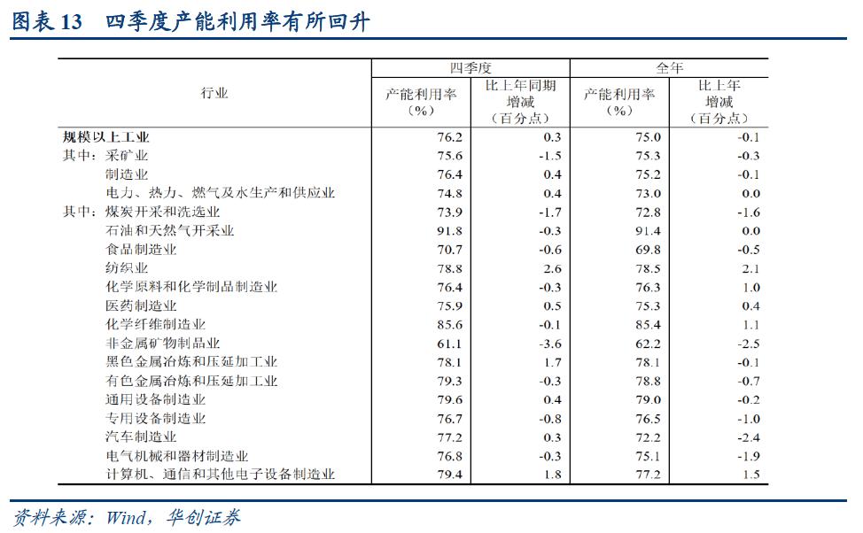 供给端来看,三大产业增速均有所回升。第一产业,4季度增速为3.7%,高于前值3.2%。第二产业,4季度增速为5.2%,高于前值4.6%。第三产业,4季度增速为5.8%,高于前值4.8%。分行业来看,4季度增速上行的包括工业、批发零售业(与社零增速回升有关)、地产业(与地产销售面积增速回升有关)、金融业、住宿餐饮业、交运仓储业等。