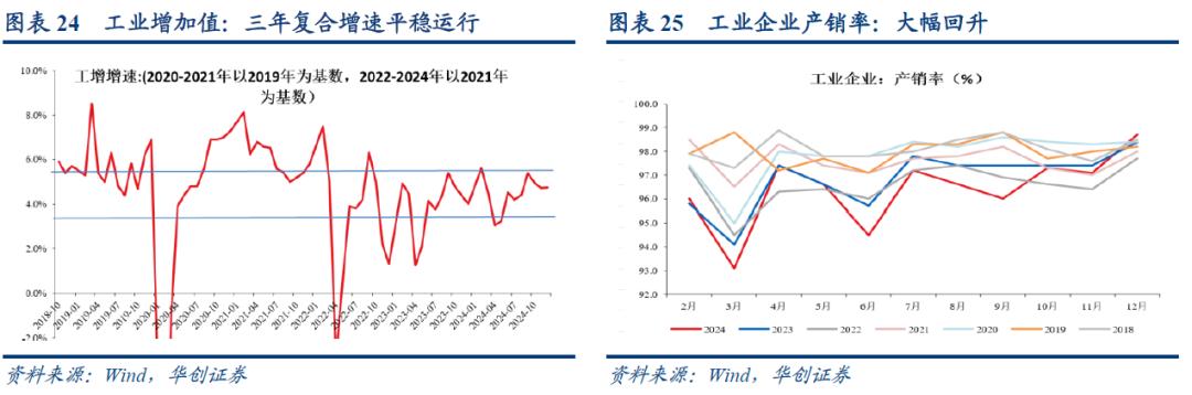 月,工业增加值同比增速为6.2%。季调环比来看,12月为0.64%。1-12月累计来看,工增增速为5.8%,属于偏高水平。产销率来看,12月份,规模以上工业企业产品销售率为98.7%,同比上升0.1个百分点,属于历史同期偏高水平。产销率回升或与“抢出口”有关,12月出口交货值同比增速为8.8%。