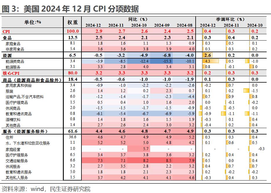 12月美国天然气价格相较11月上涨超过4%,而近期原油价格的大涨也预示着1月能源价格会继续显著上涨。此外,像家具、汽车等耐用品消费价格在同比上的改善,背后对应的是美联储去年连续降息对耐用品消费的刺激在逐步释放。