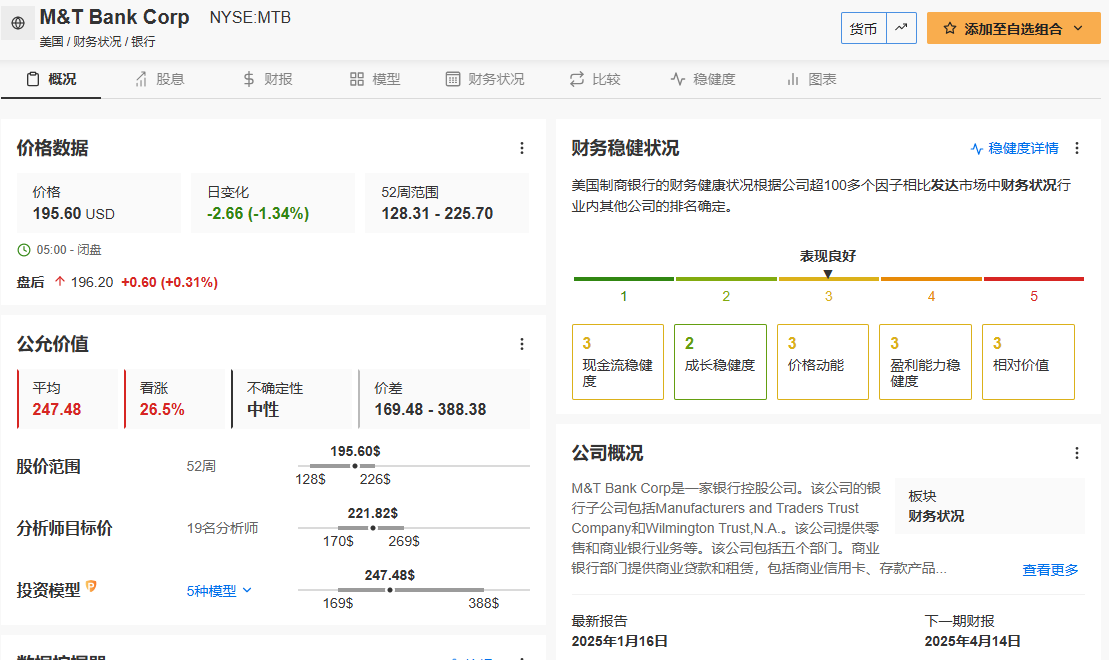 M&T银行的公允价值计算为247.48美元,而其当前交易价格为195.60美元,预示模型看涨26.5%。
