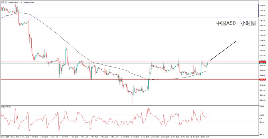 其次便是中国A50指数。上周五虽然地产表现一般,但工业与GDP表现超预期,再加上特朗普最近提到中国的次数较少,早盘时段,在LPR利率未降息的情况下,A50已经出现上涨趋势动能。开盘后存在突破13000大关的可能。不过涨势主要集中在亚盘时段,一旦特朗普在就职演讲时重提中国威胁,那么股市可能会回踩12800关口。