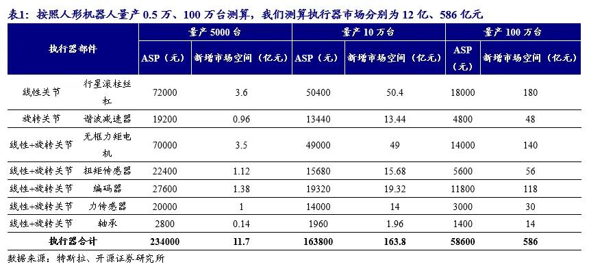 要真如马斯克所说,机器人量产目标2025年达到几千台,2026年5-10万台,2027年有望再增加10倍。那按这一出货量,相应的执行器市场就会分别达到12亿、164亿、586亿元,同样呈现倍数增长。
