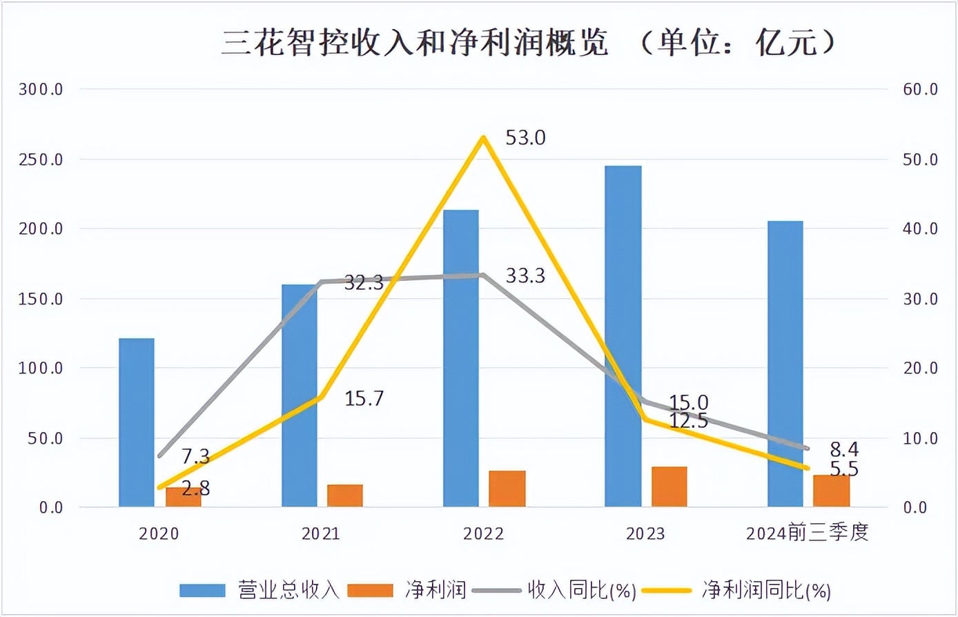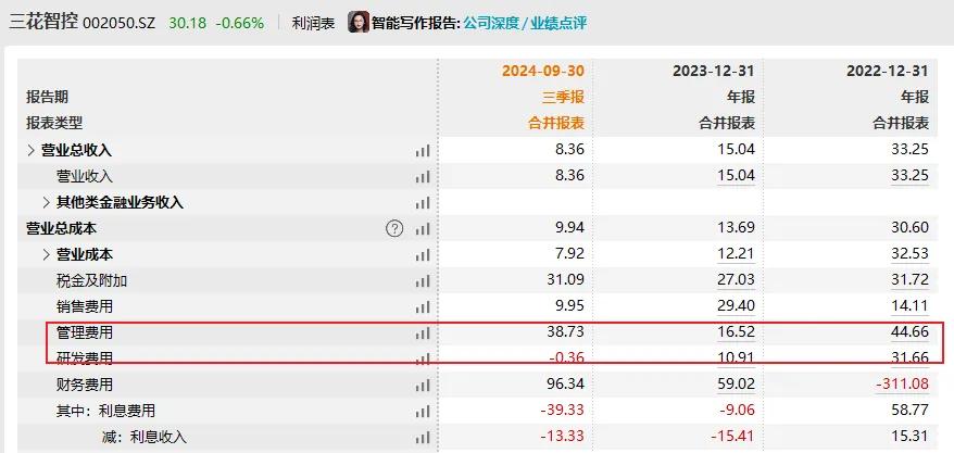 截至2024 年前三季度,三花智控营业收入为205.63 亿元,同比增长 8.36%;净利润为23.20 亿元,同比增长 5.53%。分季度来看,公司营收分别同比增长 13.4%、5.6%、6.8%,扣非净利润变动分别为 20.5%、-6%、-4.5%,呈现恶化趋势。
