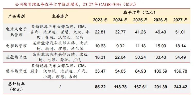 行业数据显示,三花智控热管理业务的在手订单,由2023年的85.22亿增至2027年的近240亿,年复合增速达30%。这位主要是由于新能源汽车行业景气带动的。