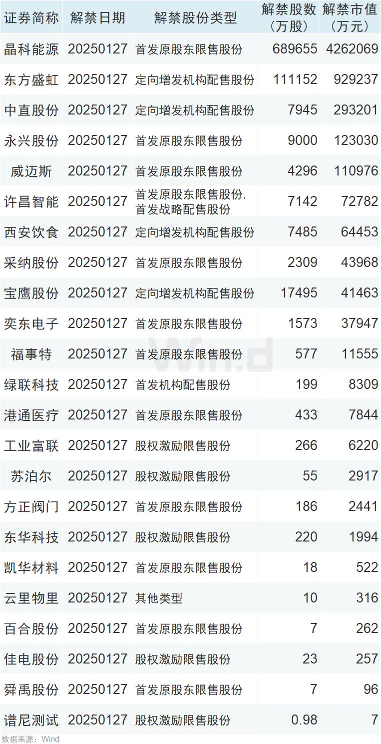 从解禁市值来看,1 月 27 日是解禁高峰期,23 家公司解禁市值合计 602.19 亿元,占本周解禁规模的 100%。按 1 月 24 日收盘价计算,解禁市值居前三位的是:晶科能源(426.21 亿元)、东方盛虹(92.92 亿元)、中直股份(29.32 亿元)。从个股的解禁量看,解禁股数居前三位的是:晶科能源(68.97 亿股)、东方盛虹(11.12 亿股)、宝鹰股份(1.75 亿股)。