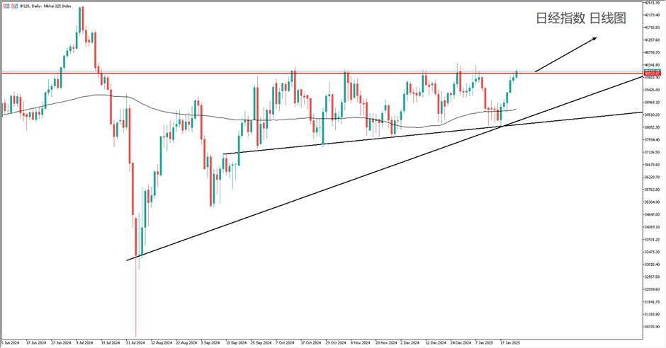 消息面:如果日央加息后,日经指数仍能够站稳40000大关,该跌不跌理应看涨,那么下周开始便以突破跟涨为主。需要注意,加息对于日经指数不一定是坏事,反而释放了日本经济摆脱通缩的信号。