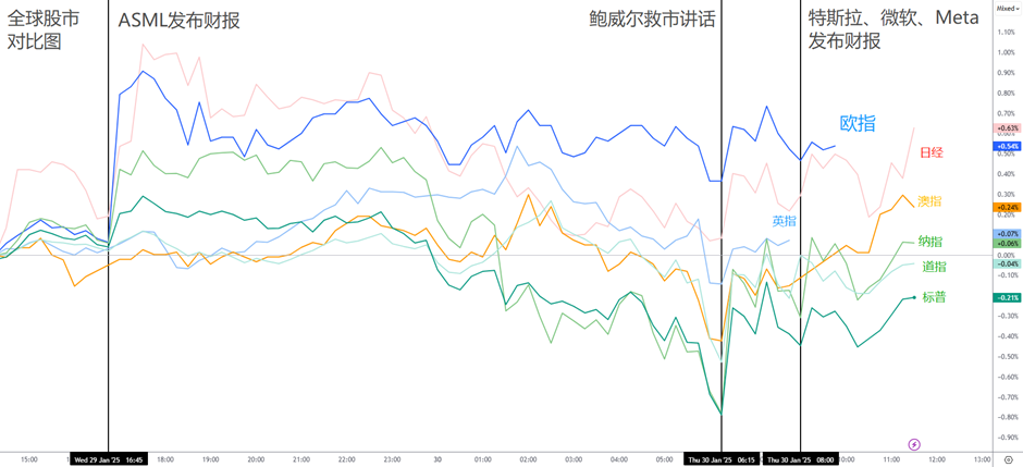 美国股市:ASML的表现推动了纳指和标普指数,但在鲍威尔讲话前,三大股指整体走势低迷,持续下跌。DeepSeek的负面影响仍未完全消化。不过,鲍威尔提到AI领域的下跌不可持续,叠加科技巨头盘后财报提振,三大股指迅速回补跌幅,日经指数也收益上涨。