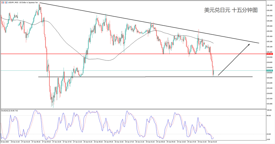 技术面:100均线向下,趋势线提供阻力,汇率已经突破三角形下沿以及关键水平线155关口,按理说,技术形态上呈现空头趋势。但考虑到基本面的影响,日内仍有超跌反弹的可能。因此日内交易策略以低位看涨为主,可以配合随机指标超买区金叉的信号。