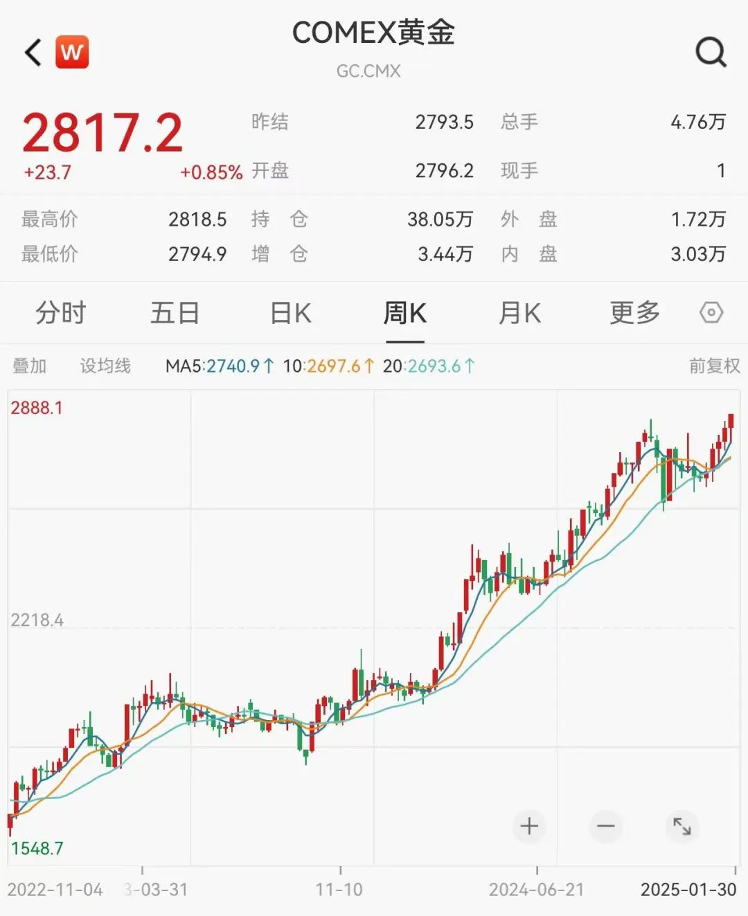 全球金融市场再度聚焦黄金这一传统避险资产。截至1月30日,COMEX期金刷新历史新高,最高触及2818.5美元/盎司,现货黄金涨0.68%报2777美元/盎司。