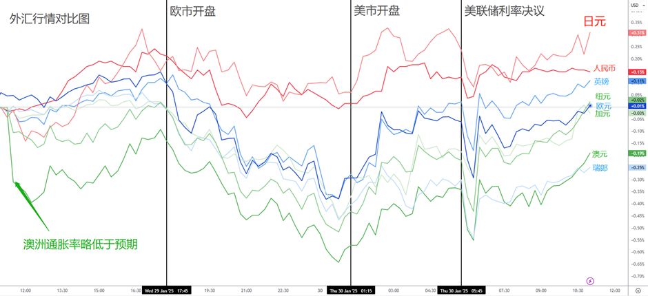 商品货币(澳元、纽元、加元):早盘,澳洲发布低于预期的通胀率,引发澳元快速下跌,因而全天表现最差。在欧盘与美盘时段,商品货币和欧系货币同涨同跌,表现落后。加拿大降息对加元几乎无影响,反倒在降息后,加拿大长债利率随美债持续走高。