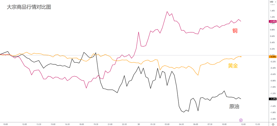 大宗商品市场表现分化明显。在缺乏明确消息面的情况下,铜等金属类商品自欧洲交易时段开始大幅上涨,黄金则维持横盘震荡,原油价格则延续稳定下行趋势。