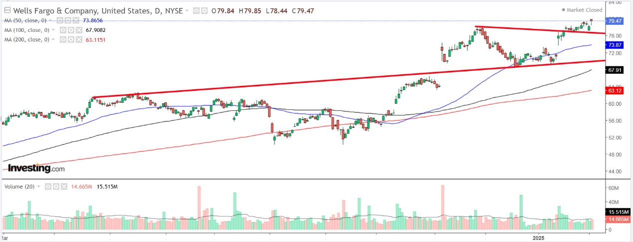 富国银行依旧是美国规模最大、知名度最高的金融机构之一,拥有稳固的存款基础和多元化的贷款业务。近期,该股股价创下79.85美元的历史新高,较去年同期飙升63%,表现格外抢眼。