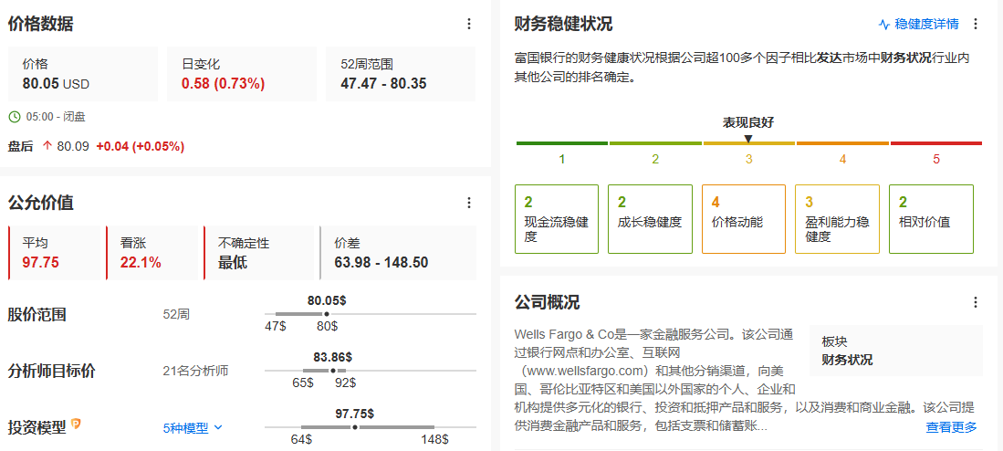 二、富国银行80.05美元