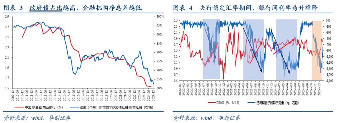 新增政府债占新增社融的比重越高,或意味着金融机构新增资产的回报越低。历史经验来看,新增的政府债占社融比重越高(非政府债社融占社融比重越低),商业银行的净息差回落压力也就越大,因此,央行降低金融机构负债端成本的必要性就越强。事实上,无论中央经济工作会议明确“适时降准降息”,还是2024年12月政治局会议强调“适度宽松的货币政策”,也都从表述上支撑着取向偏宽的货币政策。