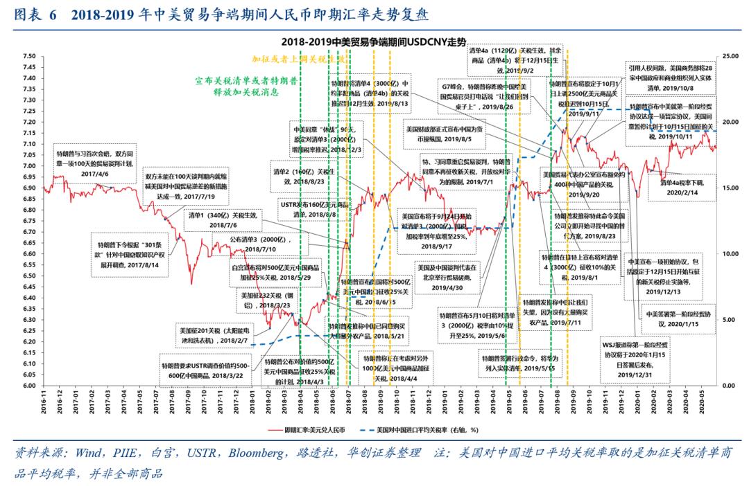 另一方面,复盘2018-19年汇率波动经验可以看到,汇率贬值最快阶段往往是关税消息发布后到关税实际生效落地前,因此短期来看汇率贬值最快阶段或已过去,下一次波动风险或需警惕的是特朗普升级对华关税。如2018年,汇率贬值最快是3月-7月,即期汇率由6.25附近大幅贬至6.8左右,随后伴随清单1(340亿)关税生效,贬值告一段落,并于7月10日清单3(2000亿)公布后再度开启快速贬值,由6.6附近贬到8月中旬6.9左右,等到清单3(2000亿)关税于9月实际落地生效时,汇率贬值速度已经明显放缓。与之类似,2019年,汇率贬值最快阶段的起始点是8月特朗普发推称将对清单4(3000亿)加征关税,而等到9月清单4中部分商品(即清单4a,价值1120亿)关税真正生效时,即期汇率基本已经触顶。