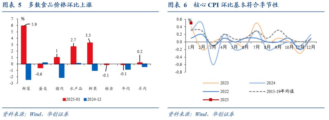 食品层面,受天气条件较好、生猪供给宽松等因素影响,虽然春节期间需求明显增加,但食品价格仅上涨1.3% ,弱于季节性。鲜菜、鲜果和水产品价格分别上涨了5.9%、3.3%和2.7%,猪肉价格仅上涨1%。