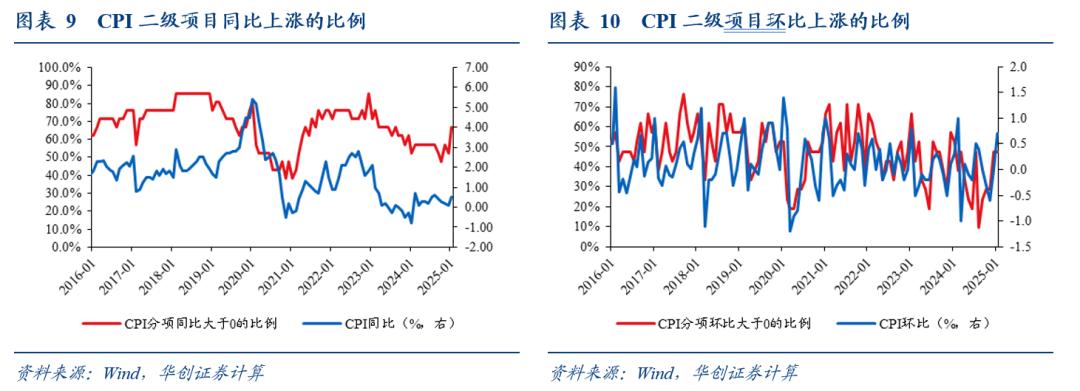 项目环比涨价的比例持平。以21个CPI二级项目作为观察对象,环比来看,涨价比例持平于48%,处于2016年以来的36.7%分位。同比来看,涨价比例从52.4%升至66.7%,处于2016年以来的33%分位。