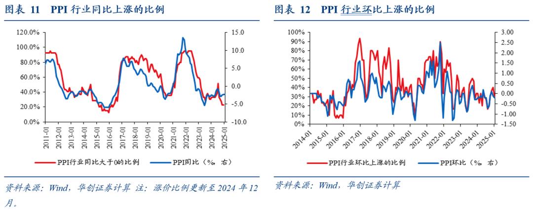 行业的环比涨价范围小幅收窄,有可比数据的30个行业中,价格上涨的行业个数从12个降至9个,涨价比例从40%降至30%,处于2013年8月有数据以来的27.4%分位。同比来看,39个行业中,去年12月的涨价比例持平于23.1%,处于2011年以来的7.8%分位。