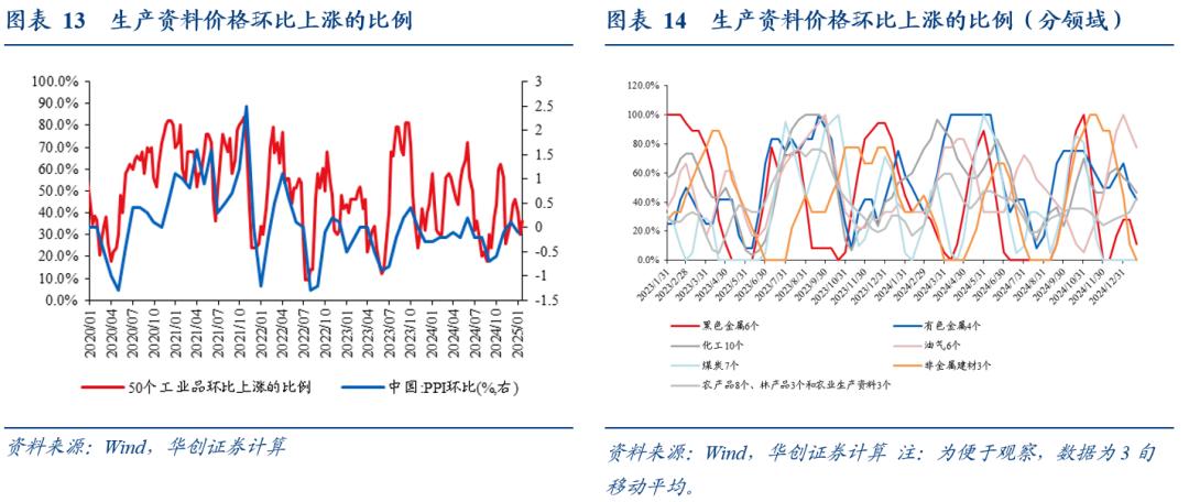 个流通领域生产资料价格的环比涨价比例小幅收窄。去年12月下旬至今年1月下旬,环比来看,涨价比例从40%降至36%,2014年以来的历史分位从39%降至31.3%,除农林产品外,其余领域的涨价比例均有所回落。